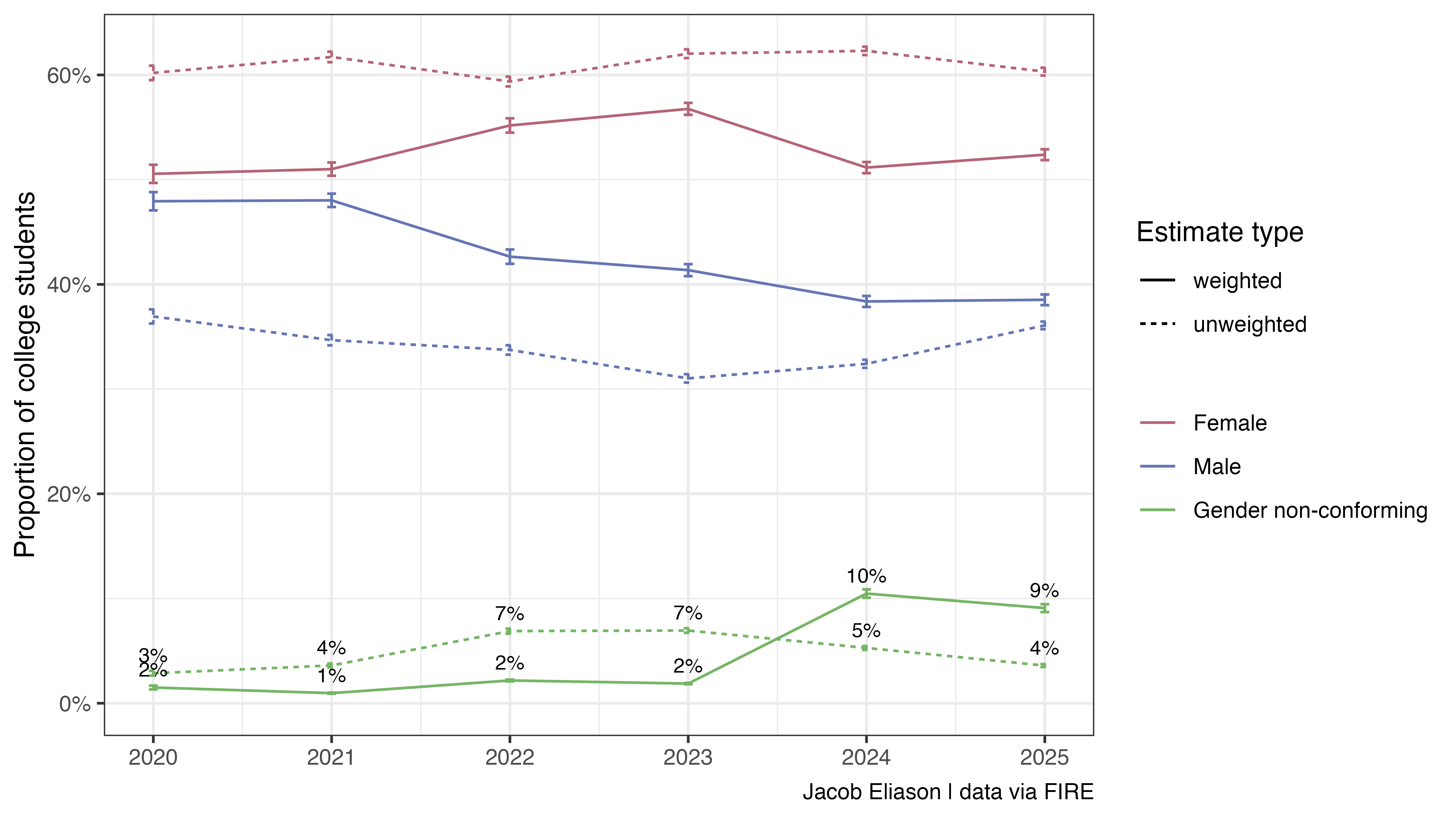 This conclusion, based on analysis of survey data collected for FIRE’s College Free Speech Rankings, suffers from several issues, including a significant analytical error I haven’t seen documented yet: Kaufmann failed to use the survey weights required to produce representative survey estimates. Using the same dataset, I calculated both unweighted and weighted estimates of gender non-conforming identification by year. The unweighted series reproduces Kaufmann’s numbers, but the weighted series (appropriate for inference) shows a different trend.