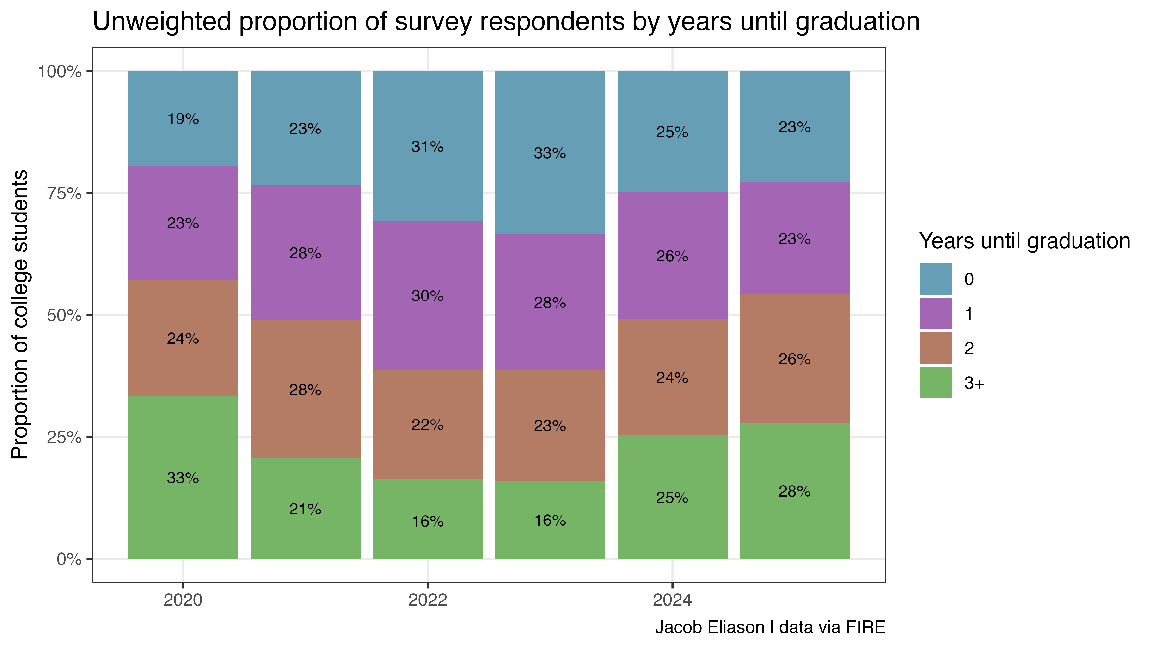 For example, the following chart shows the FIRE dataset’s unweighted proportions for graduation year (gradyear; expressed for visual clarity as years from survey collection date) over time. A close inspection might identify a pattern similar to the one found in Kaufmann’s original chart. Did the proportion of American college students about to graduate surge by 74% and then collapse by 30% between 2020-2025?