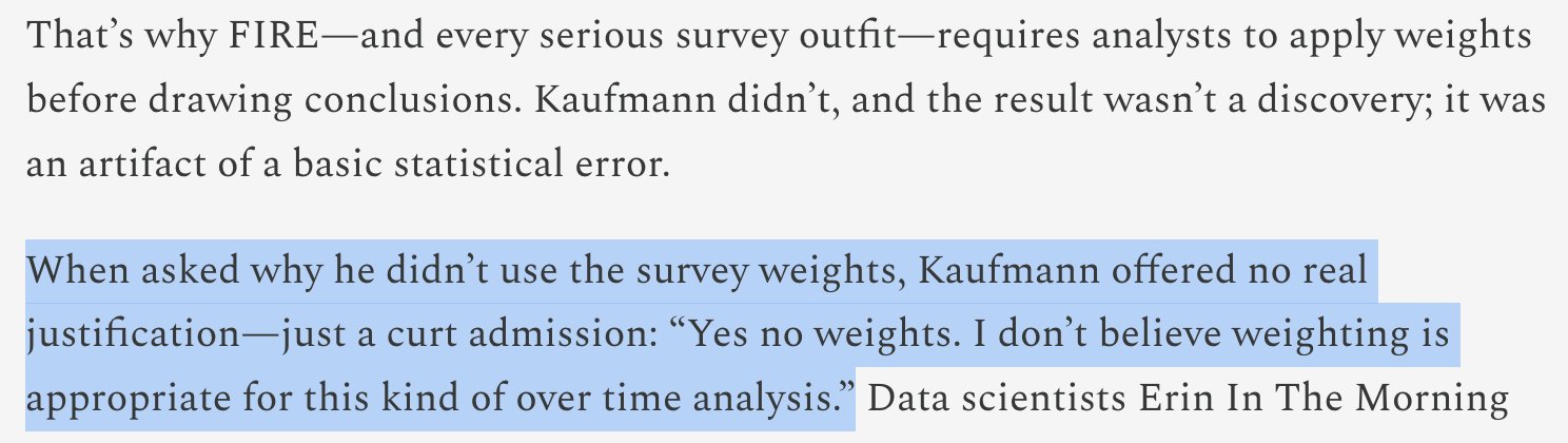 FIRE’s survey is primarily focused on free speech. Since this survey is only intrumentally interested in gender identity, FIRE might reasonably make changes to how gender is treated in the weighting protocol from one year to the next that could disrupt an attempt to estimate a trend like the one Kaufmann investigates. I haven’t asked FIRE, but I strongly suspect something like that may have happened. For example, if one of their weighting sources moved from two gender identity choices to three, I’d expect to see something close to the observed jump in the weighted series’ value from 2023 to 2024. In fact, it looks like this is the case at IPEDS, one of the data sources for weighting.